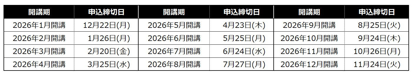 ▼受講申込み締切日(開講日から5営業日前の15:00まで)